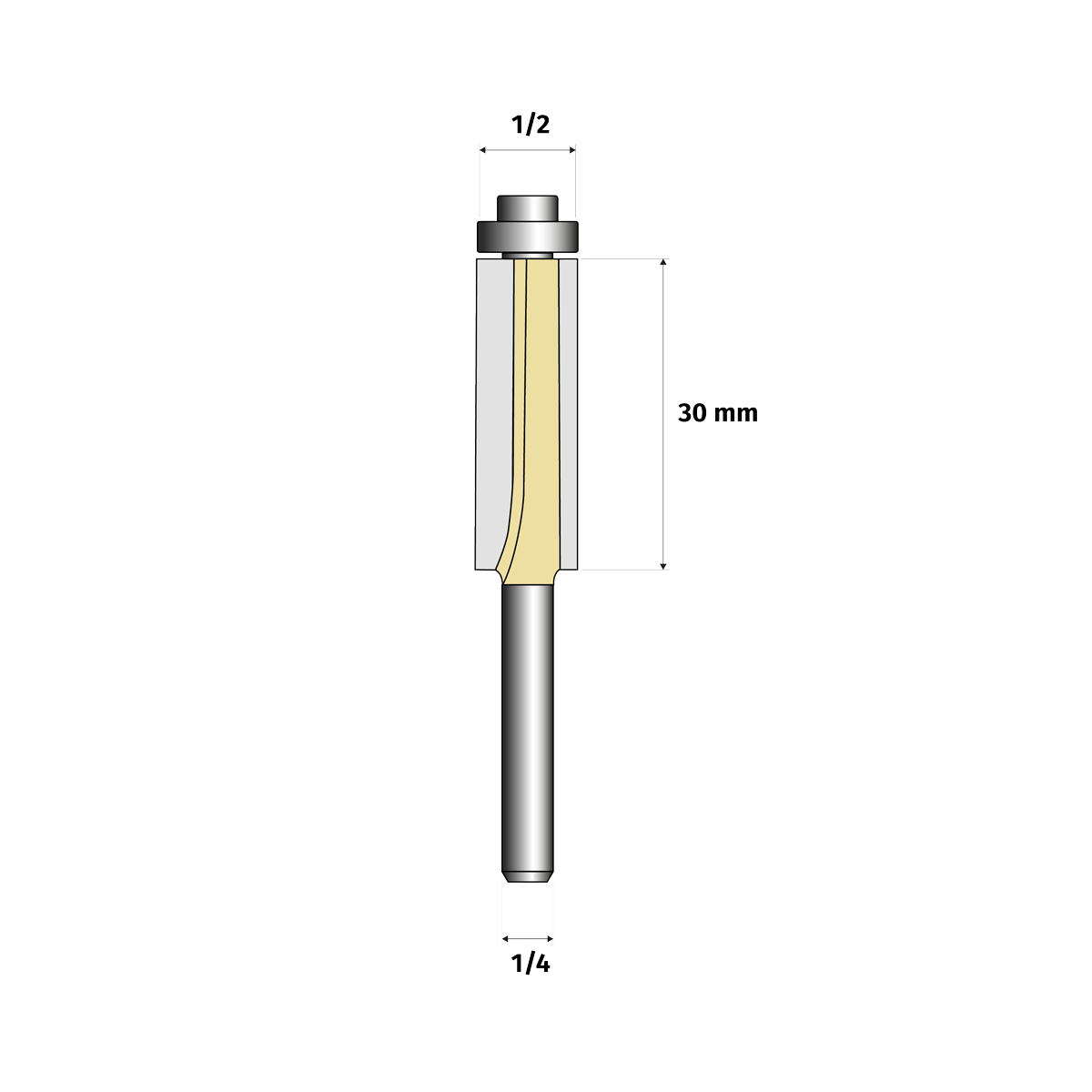 Cuenta con un diámetro de corte de 1/2, vástago de 1/4 y un largo de corte de 30 mm, combinando la capacidad de corte de una fresa de 1/2 con la versatilidad de un vástago de 1/4.